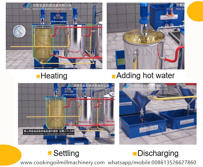 Hydration degumming method is using the hydrophilicity of colloid impurities, to add hot water or electrolyte solution to make the colloid absorb water to become larger, so that to use gravity or centrifuge can separate the colloid impurities from oil. But hydration degumming method will produce large quality of waste water, so you should to deal with it.